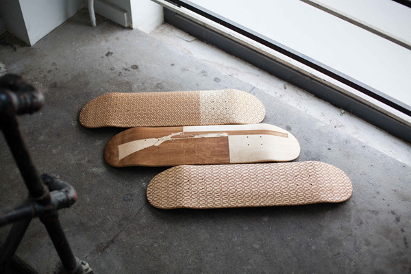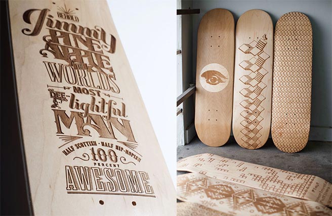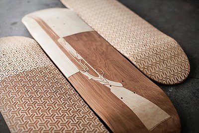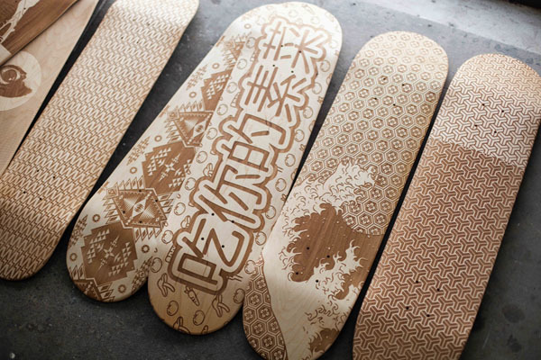 激光雕刻滑板是使木板表面受到強大的激光熱能而溫度急劇增加,使該點因高溫而迅速的融化或者汽化,配合激光頭的運行軌跡從而做出想要的圖形文字。激光雕刻速度快,精度高、無論何種形狀何種圖案都可以精準快速成型。